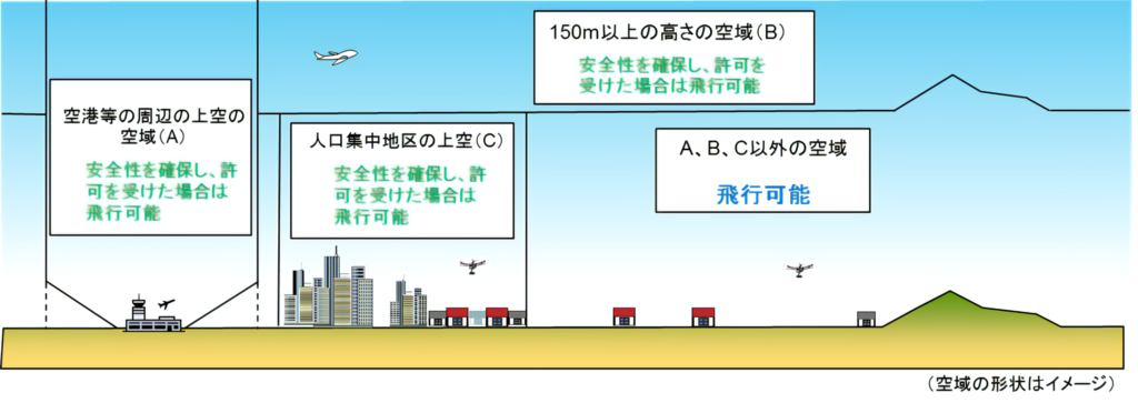 ■ 無人航空機(ドローン・ラジコン機等)を運用にあたり飛行する場所等によっては、航空法に基づく飛行ルールに従って運用する必要があり、それに伴い国土交通大臣の許可が必要になります。